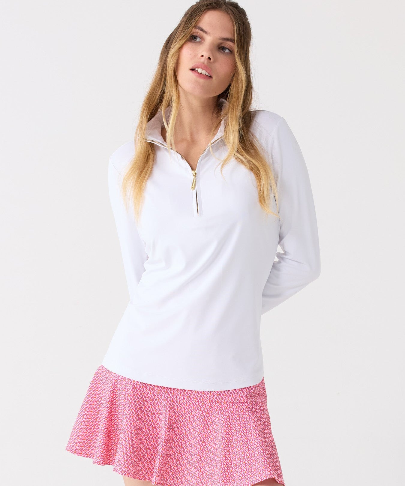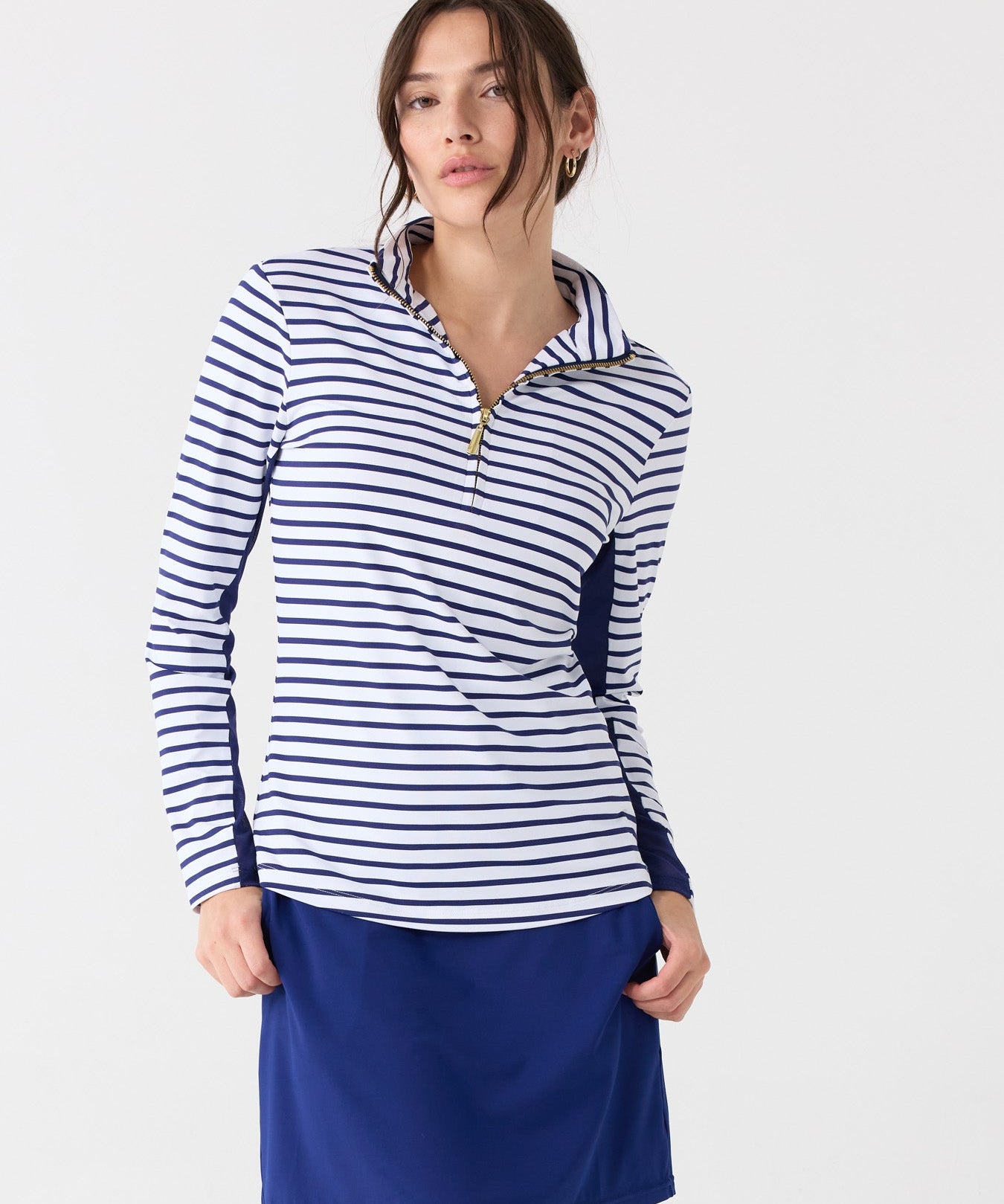 I love this top and it fit true to size. I am a Medium. I like a slightly loose fit and it was. This top is also great on its own over my summer skirts and Denims. The half zip front allows for easy on and off too!